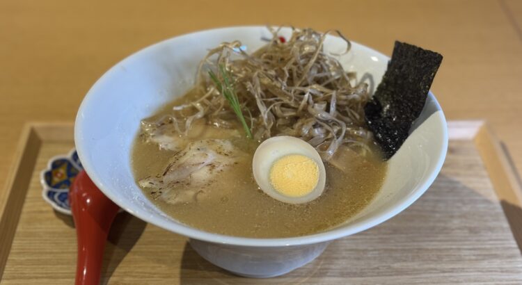 炙りチキンチャーシューにたっぷりのごぼうチップスなどトッピングが豪華。野菜スープをベースにしつつ、しっかりとした旨味と味噌のコクが重なり、深みのある味わいに。ごぼうやチャーシューからも旨みが溶け出し、満足度の高い一杯です。
