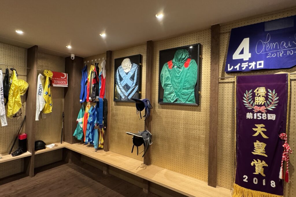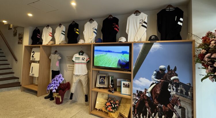 2階のショップにはルメール選手が実際着用していたウインドブレーカーや鞍が置いてあり、手に取ることも可能です。