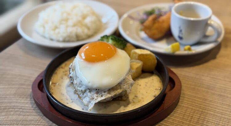 名物の鉄板ハンバーグにたっぷりのトッピングを付けた豪華なランチ。
