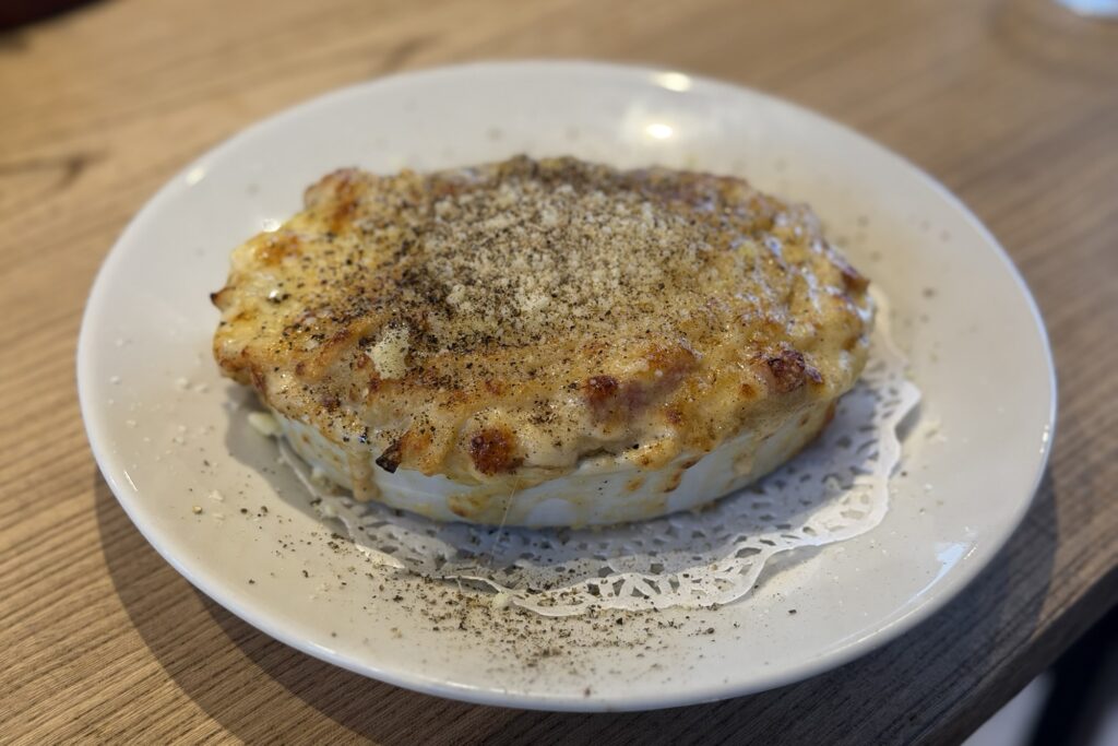 生パスタにカルボナーラのグラタンが絡み、パンチのある味わい。濃厚なだけでなく深みと繊細も併せ持っていいます。