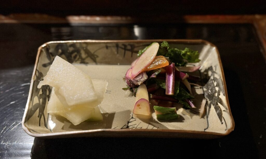 まずはお漬物とお酒で喉を潤します。