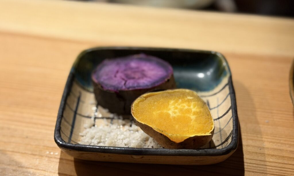 この日の焼き野菜は亀岡産の紫芋や蓮根など。炭火で火入れしているので、香りもよく、