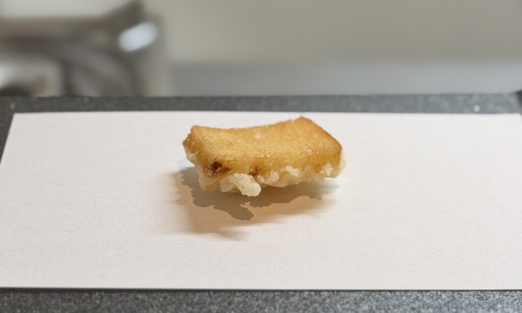 1品目はパンに海老を乗せた海老パン。海老の濃厚な味わいを感じつつ、パン独自のサクッとした食感が新鮮です。