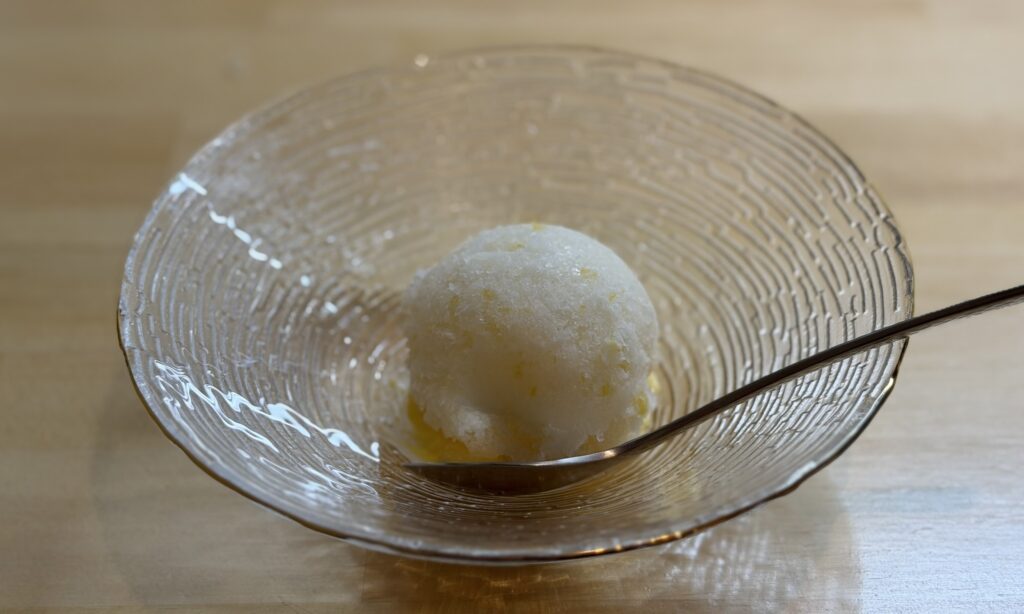 レモンシャーベットの下にはカスタードソースが。さっぱりしすぎないようカスタードがいい仕事をしています。
