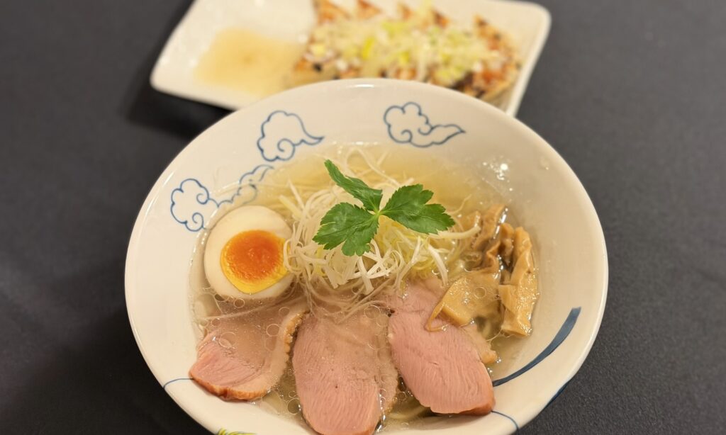鴨100%スープに鴨肉チャーシューと柚子の香りで仕上げた上品な一杯。爽やかな余韻が広がる。特製ネギ塩だれを添えた餃子も相性抜群。