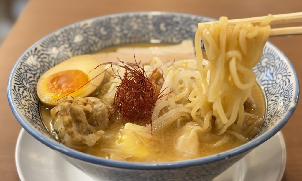 山形発祥・満月らしさ全開の一杯。太麺150gともやしを豪快に盛り、もっちり力強い食感が満足感を高める。まろやかなワンタンにホタテとバターの旨み、糸唐辛子と辛味噌が味を引き締める。旨辛バージョンなどもあり。