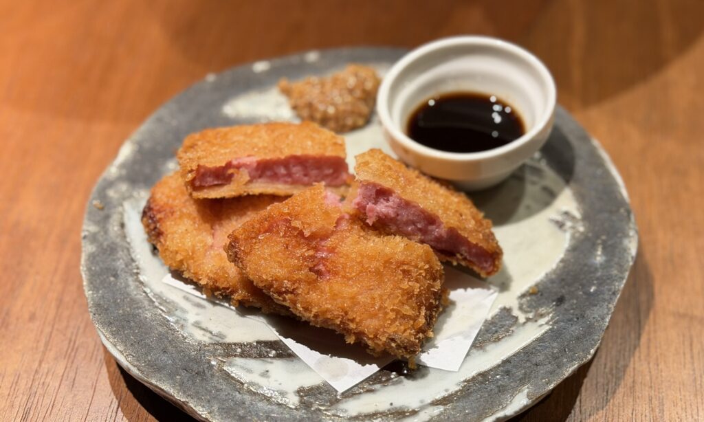 ソースと粒マスタードでいただく厚切りのハムカツは、衣もしっかりとしていて食感があり食べ応えがあります。