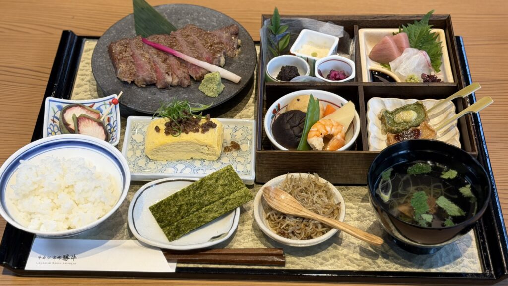 黒毛和牛の西京漬け焼き、ちりめん山椒、ごはん、小箱(柴漬け/内海苔/生湯薬、お造り2種盛、生麩田楽、本日の小鉢)、牛タンの吸物、出汁巻き玉子、焼き海苔、甘味がセットになった贅沢な御前。