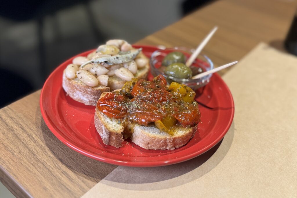 ザクザク食感のパンに、ドライトマトや豆をのせた一品。ワインが進む軽やかな前菜です。