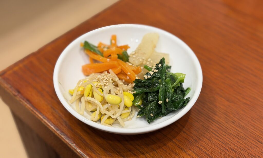 水キムチやナムル盛り合わせを楽しみながらメインの到着を待ちます。