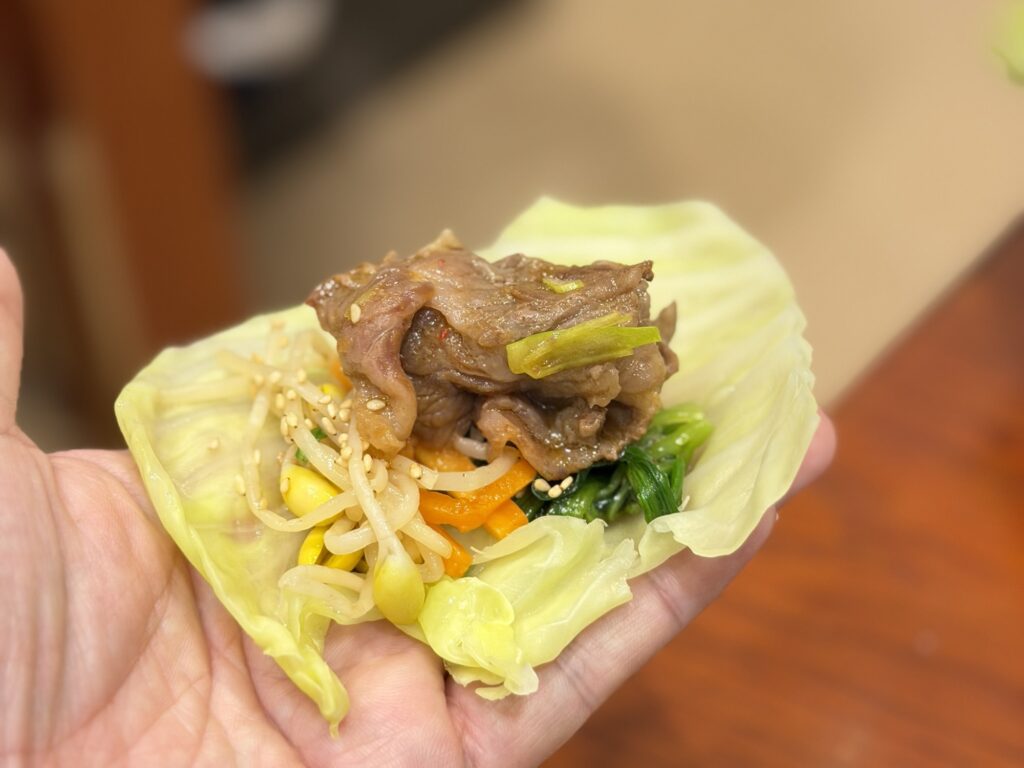 名物のプルコギは、黒毛和牛にコクと旨みのある特製タレをたっぷり付けて野菜で巻いて食べると絶品。