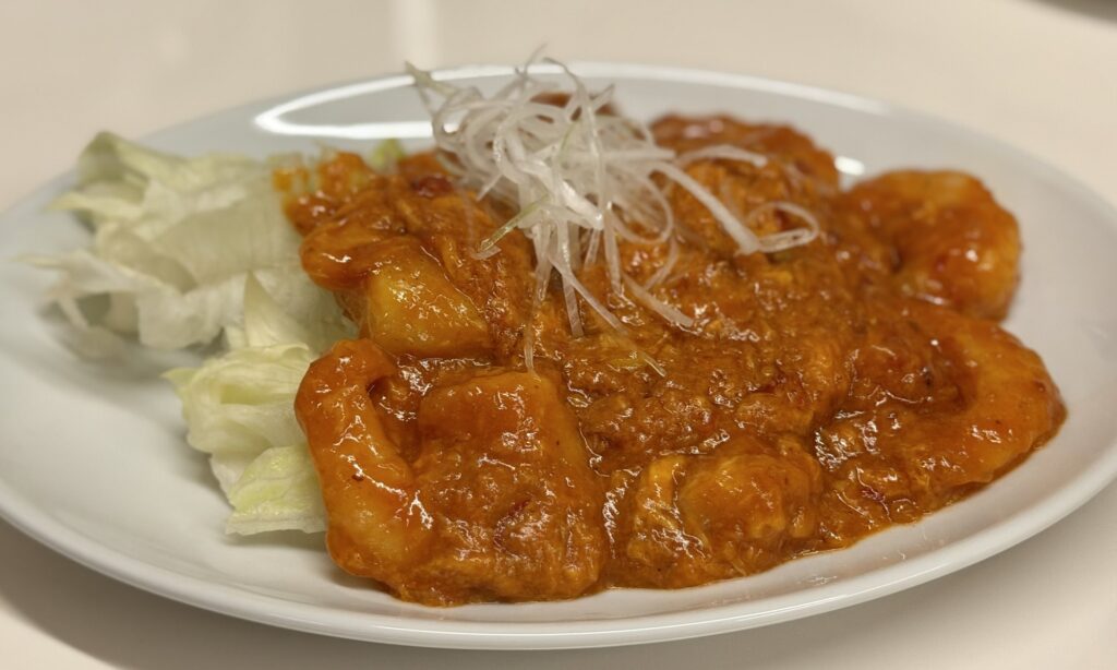 濃厚で甘辛いソースがぷりぷりの海老に絡み、にんにくと豆板醤のコクが広がる。後からじんわりと感じる辛さがクセになります。