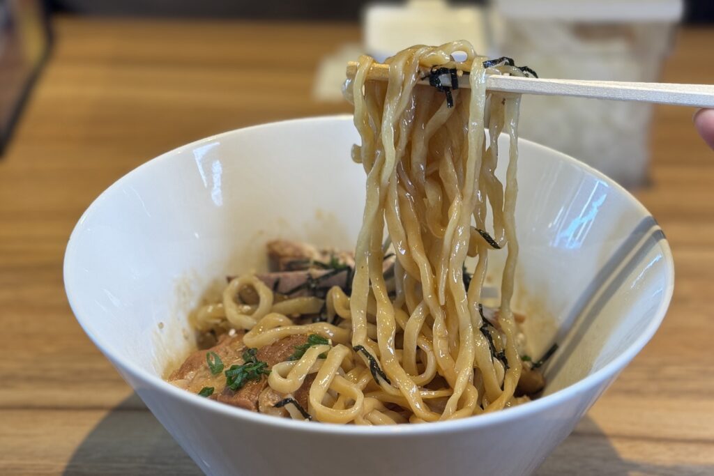麺は棣鄂製の極太麺を使用。もっちりとした弾力としっかりした噛み応えで、タレとの相性も抜群の仕上がりです。
