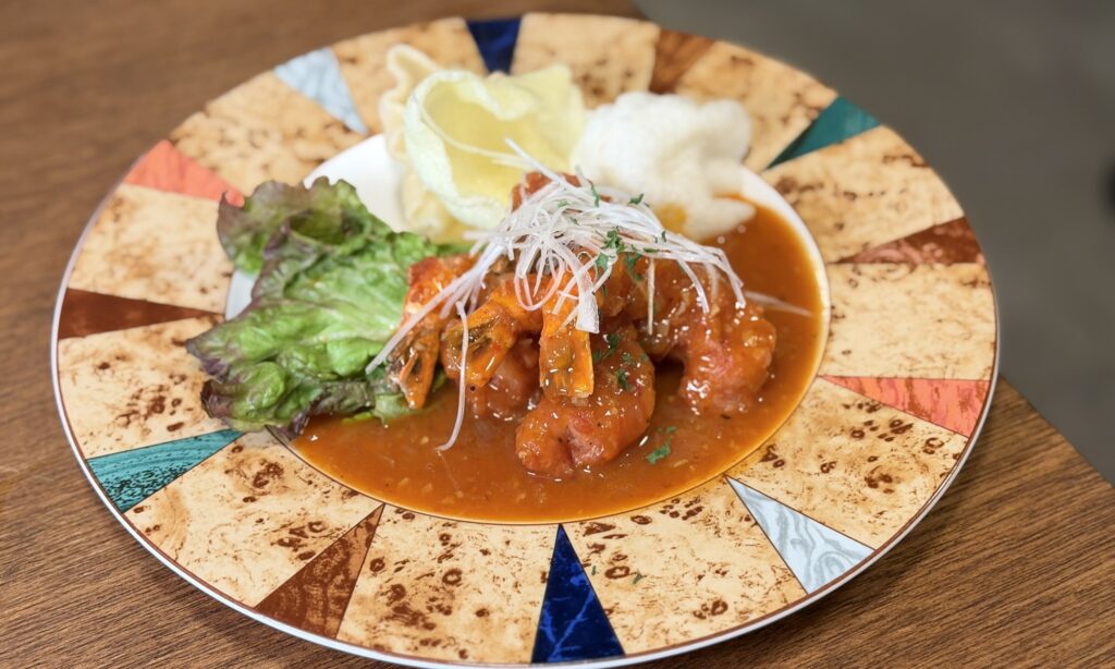 看板メニューの一つである海老チリは尻尾まで美味しく食べられるプリっと食感がたまらない一品。衣にまで海老が入っていて海老の風味が濃厚で、辛めのソースがお酒との相性抜群です。